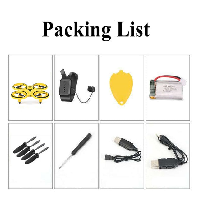 Specifications:Product Name: Gesture Sensing DroneRemote Control: Infrared sensorMain Material: ABSColor: Yellow and BlueFrequency: 2.4GHzBattery Charger: USB Plug ChargerRemote Control Distance: About 60mFlight Time: 10-15 minutesCharging Time: About 60 minutesProduct Size: 170*38mm